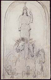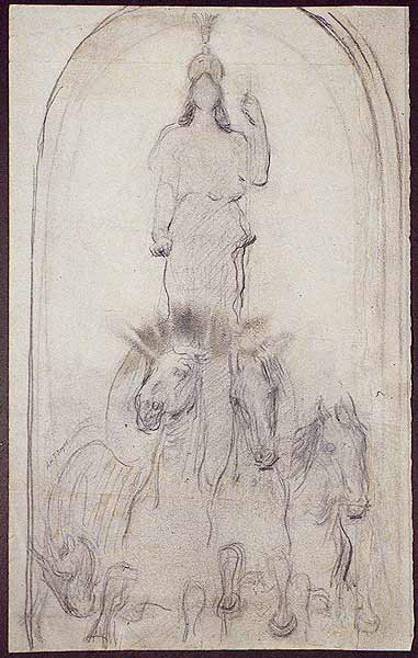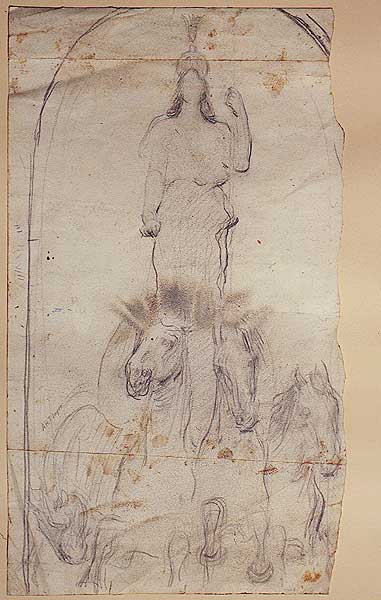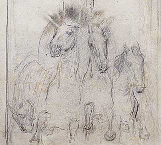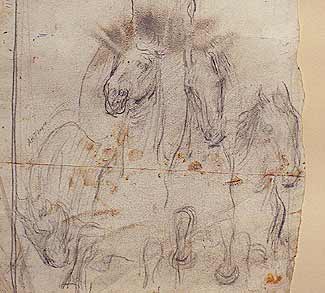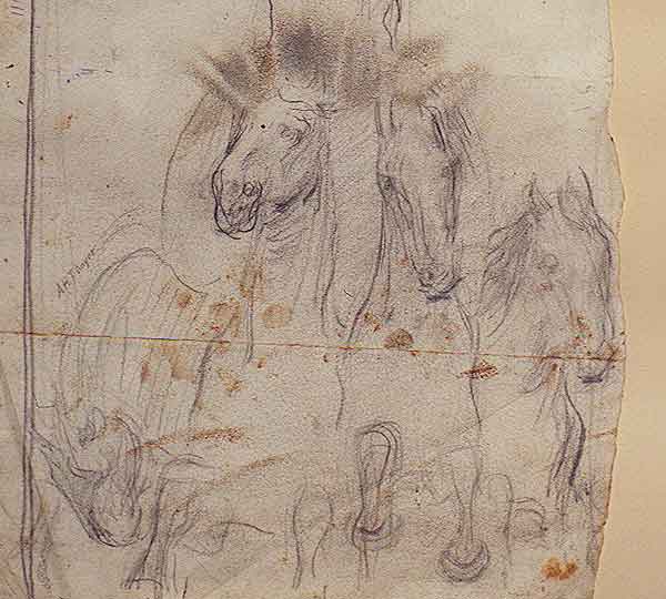 When a paper artifact is not properly protected, it may become vulnerable to a variety of surface deposits, including airborne dust and dirt, fingerprints, insect droppings, and various other types of accretions. The drawing by Abbott Thayer shown here was subjected to fingerprints consisting of some combination of dirt, oil, sweat, and/or traces of food. These darkened over time and eventually appeared as brown smudges on the images of horses.